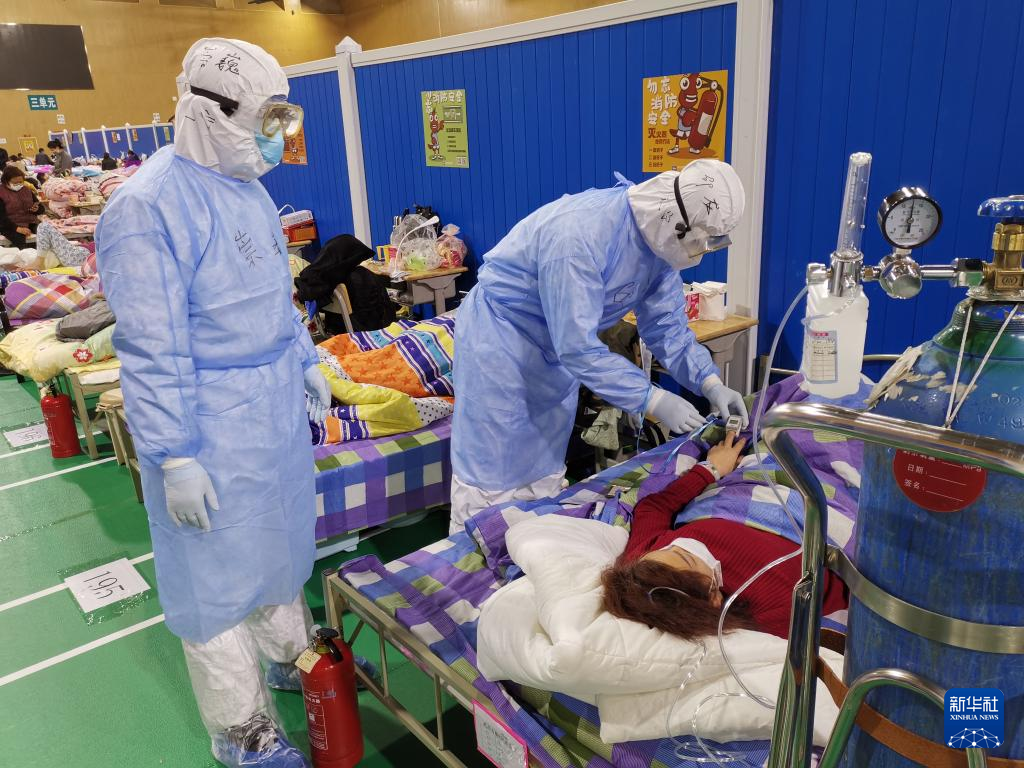 2020年2月16日,邵龙(右)在武汉武昌方舱医院对患者进行护理(资料照片)。