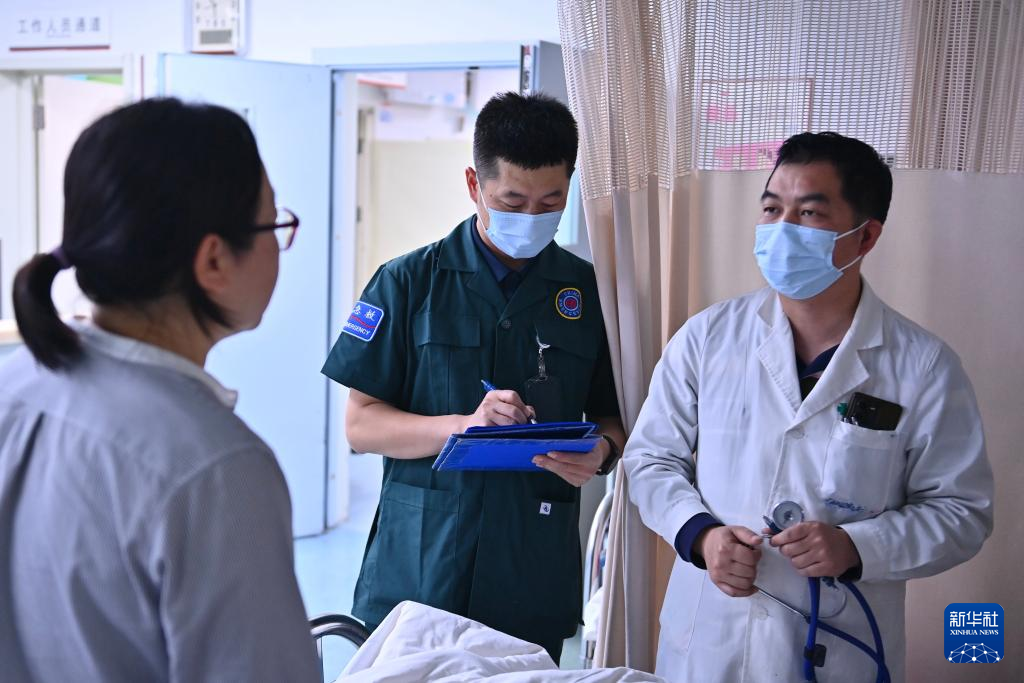 5月8日,邵龙(中)和医生一起了解新入院患者情况。
