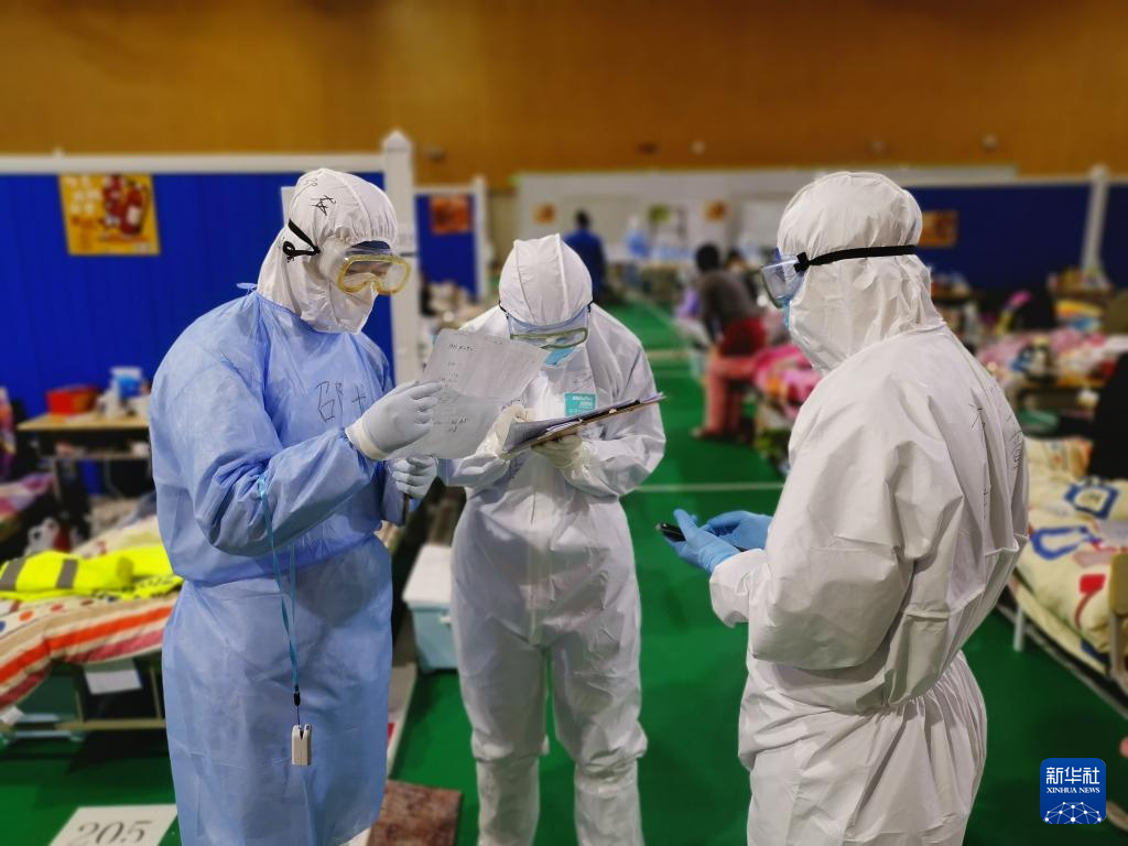 2020年2月10日,邵龙(左)在武汉武昌方舱医院交接班(资料照片)。
