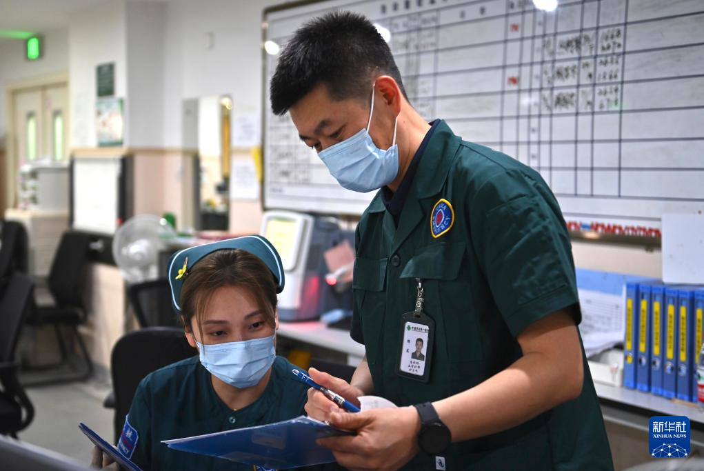 5月8日,邵龙(右)在和急诊科值班护士交流。