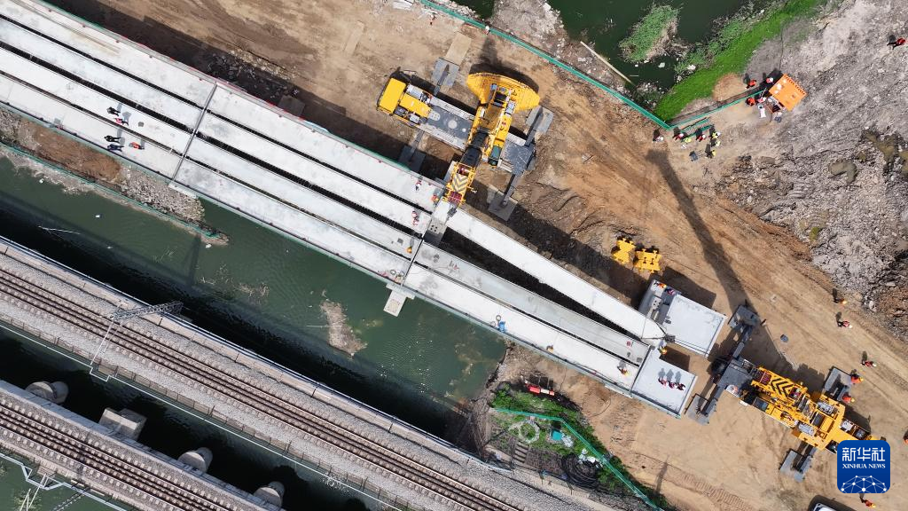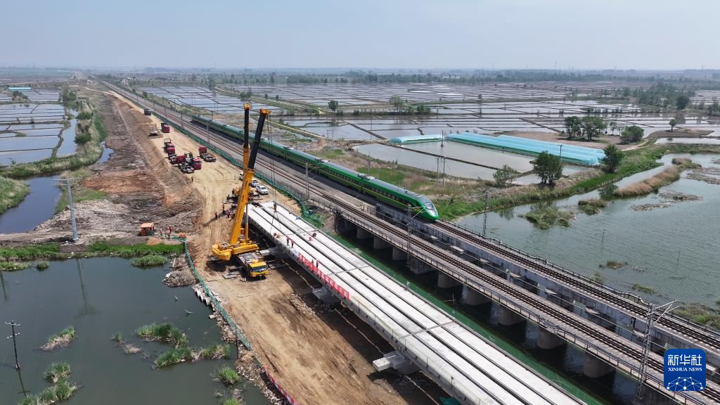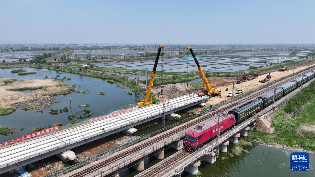 这是5月19日拍摄的沈山铁路鸭子河中桥新建大桥架梁工程施工现场(无人机照片)。