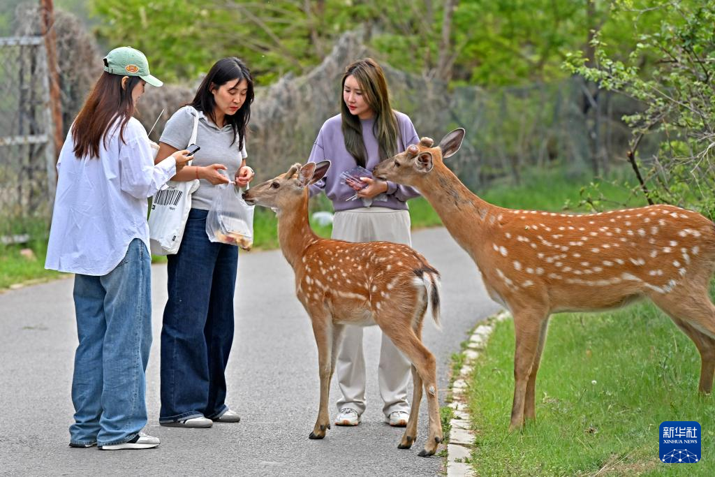 两只梅花鹿在辽宁大连市白云山山体公园和市民互动(5月21日摄)。