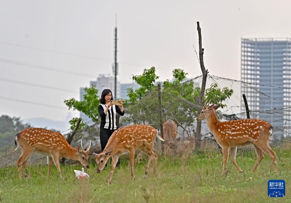 市民在辽宁大连市白云山山体公园给梅花鹿拍照(5月21日摄)。