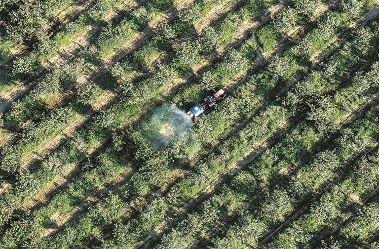 在金州三农果树基地,工作人员在果园内辛勤劳作。(记者 王华 摄)