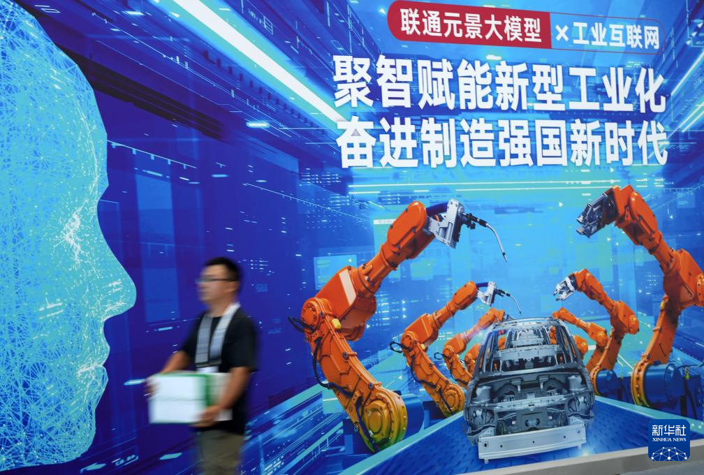 9月5日,在沈阳的2025全球工业互联网大会的展览区现场,一名工作人员走过广告板。