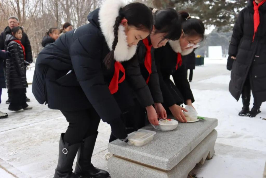 祭扫仪式后,学生们将亲手书写的家书与饱含心意的饺子一同敬献于烈士墓前。一封封家书承载着对英烈的思念,一碗碗饺子寄托着跨越时空的敬意,这场特殊的“团圆饭”,让孩子们在庄严仪式中深刻体悟到今日和平生活的来之不易。
