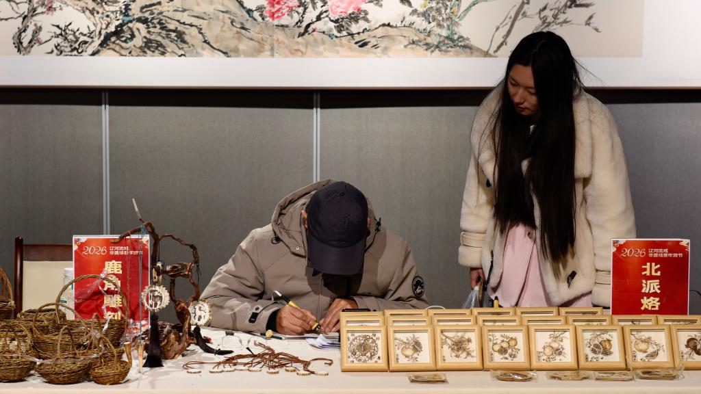 2月3日,一名手工艺人(左)在铁岭博物馆展示北派烙画技艺。