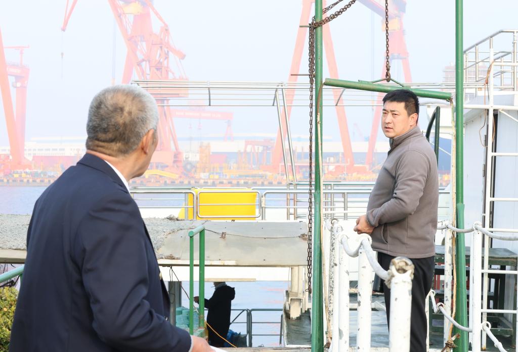 陈琦(左)在大连港码头与儿子交流工作(4月3日摄)。
