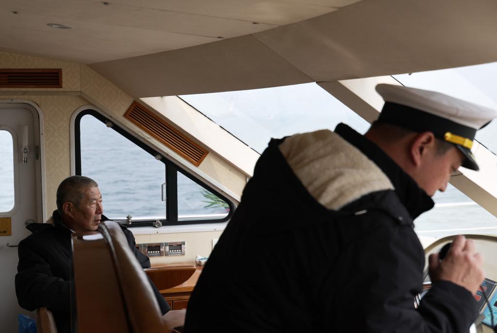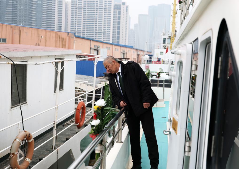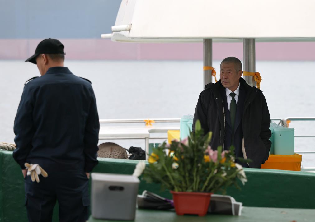 早上,陈琦乘海葬船出海(4月3日摄)。