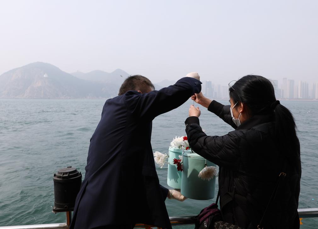 海葬船上,陈琦团队的工作人员(左)协助逝者家属完成海葬(3月29日摄)。