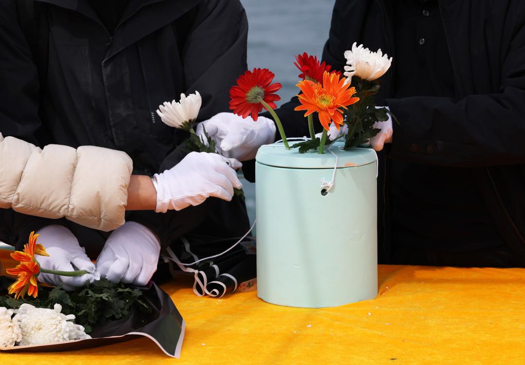海葬仪式上,陈琦团队的工作人员帮助逝者家属给可降解骨灰罐插花(3月29日摄)。