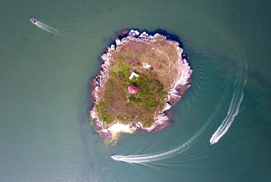 游艇在大连金普新区鹿鸣岛海域一处岛礁附近行驶(2017年6月22日摄)。新华社发(朴峰 摄)