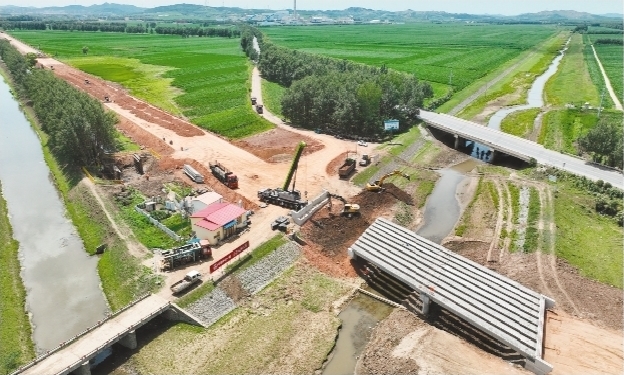 7月4日,记者在铁岭调兵山市大明镇王河桥附近看到,国道开奈线(G505)调兵山市王河桥至大冮屯段绕城改线工程(城市东外环北段)正在紧锣密鼓地展开,该工程所属跨王河桥已初具规模,桥面和引桥施工正在进行。