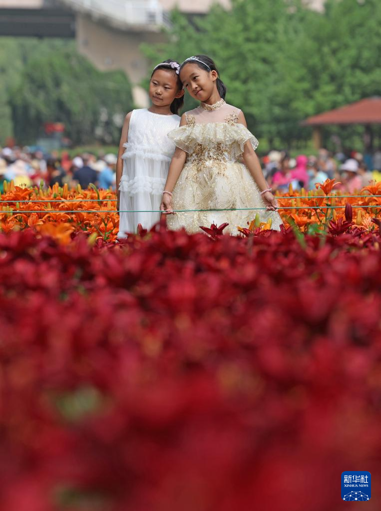 7月5日,在沈水湾公园,两名小朋友在百合花丛中拍照留念。新华社记者 杨青 摄pagebreak