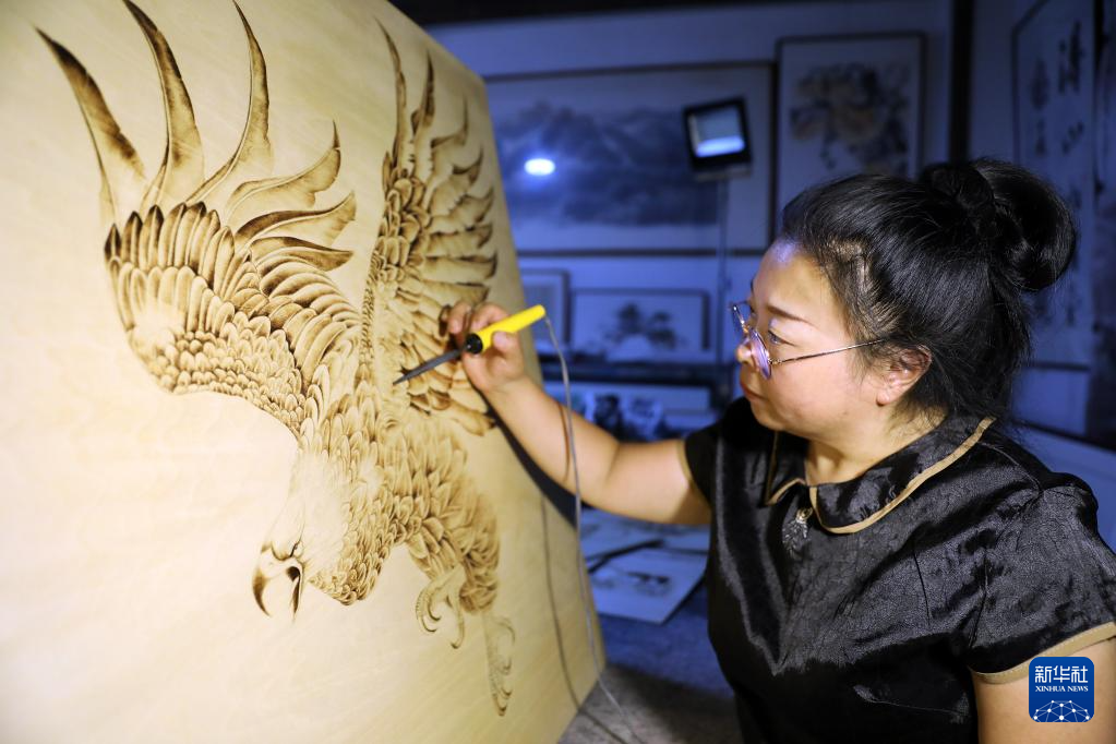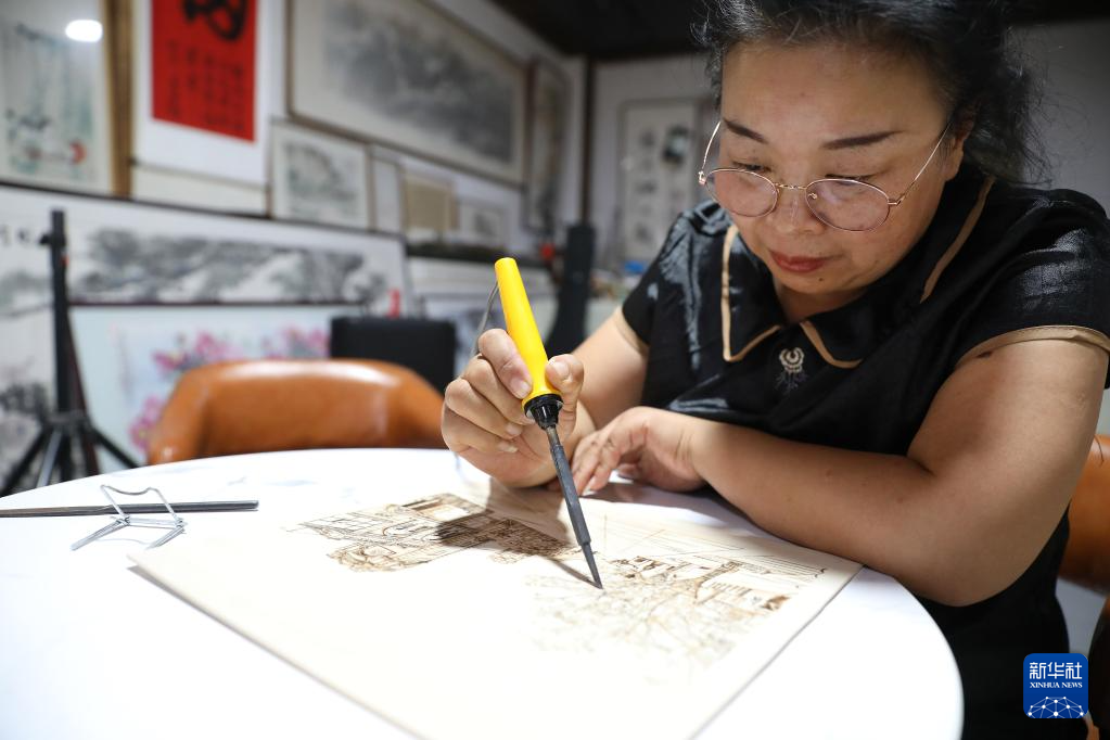 7月6日,李影在位于辽宁省营口市大石桥的工作室里进行木板烙画创作。新华社记者 姚剑锋 摄