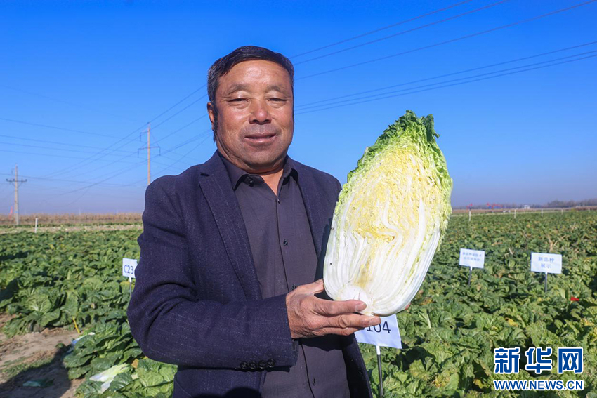 图为新民市大民屯镇白菜种植大户付新成展示丰收成果。 新华网 许志康摄