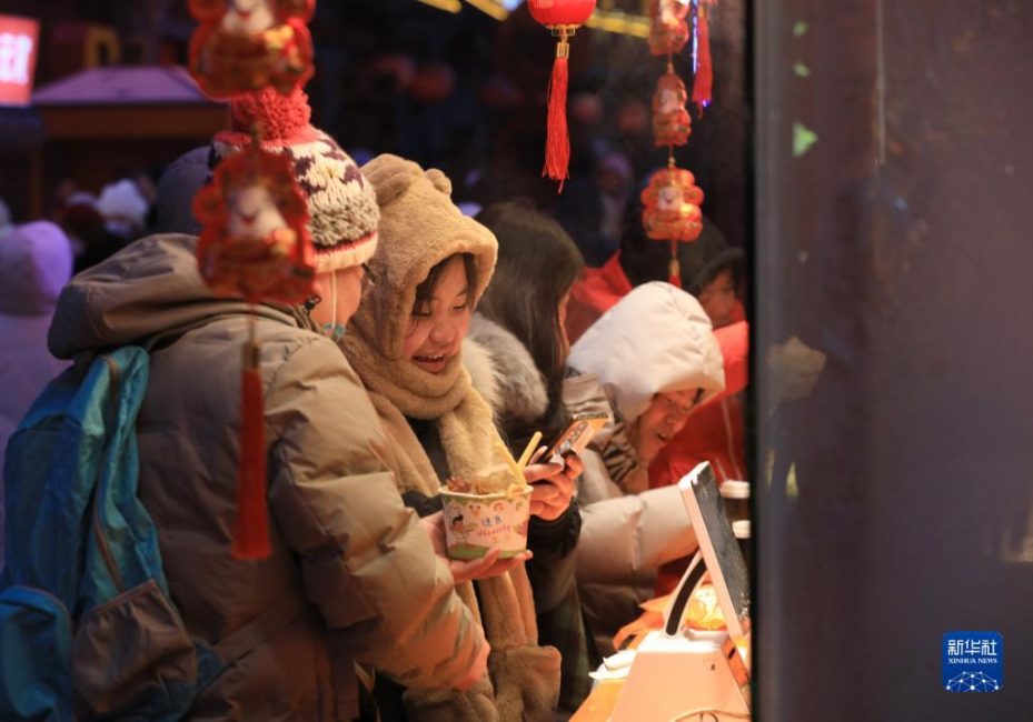 1月23日,游客在沈阳新春皇寺庙会上品尝美食。新华社记者 杨青 摄
