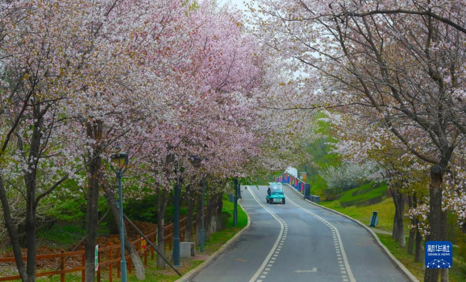 4月17日,游客乘坐游览车在沈阳世博园赏花。新华社记者 杨青 摄