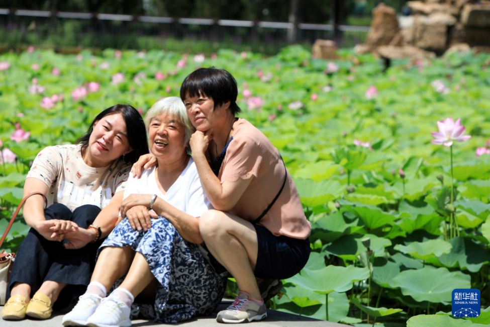 7月6日,游客在沈阳市皇姑北塔公园荷塘拍照留影。新华社记者 陈为 摄