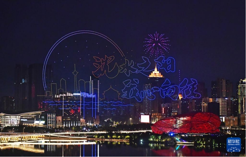 8月17日,在沈阳浑河上空区域,无人机展示“沈水之阳 我心向往”字样。新华社记者 杨青 摄