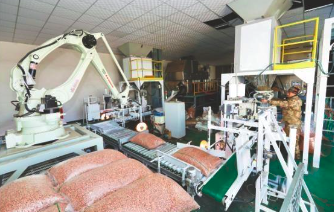 红崖子镇突出龙头带动作用,形成了“产、储、加、销”一条龙花生产业体系。全镇有385家花生加工和销售业户,花生年交易量超50万吨,交易额超40亿元,是东北地区最大的花生集散地。2020年,红崖子花生入选中国首批100个地理标志受欧盟保护名单。2021年,红崖子镇花生品牌价值评估达22.99亿元。图为花生加工企业员工在包装产品。(记者 杨兵 摄)