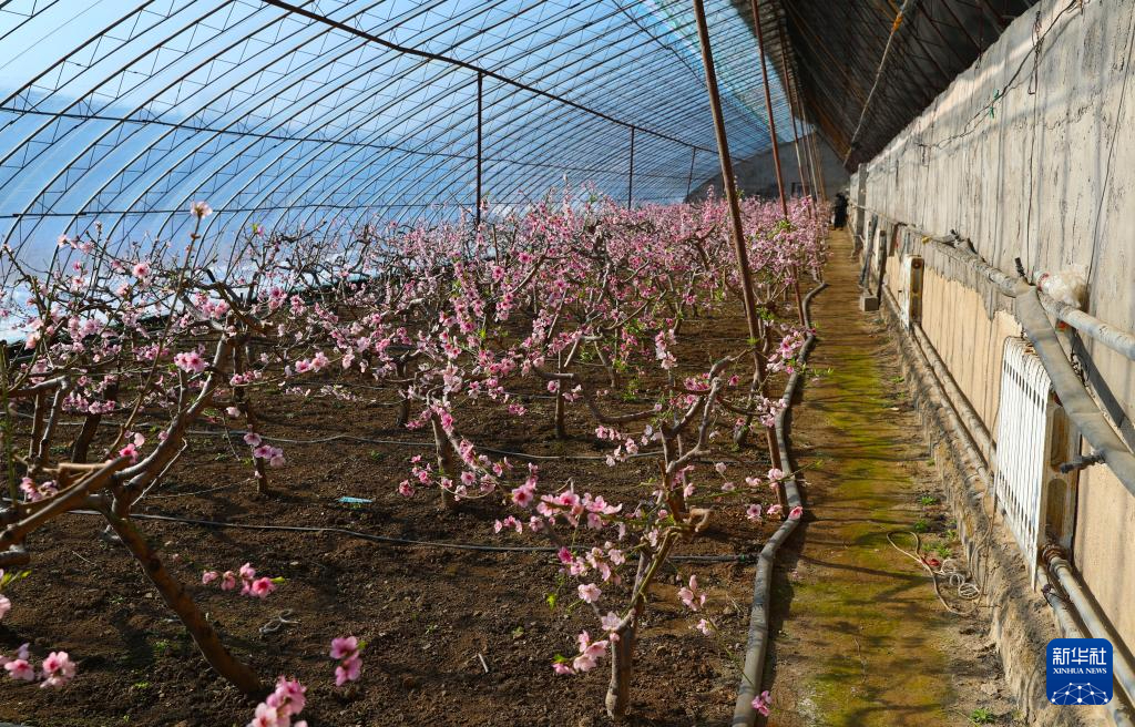 在辽宁省辽阳市辽阳县下达河乡大西沟村,大棚内种植的油桃树开满了桃花(1月24日摄)。新华社记者 杨青 摄pagebreak
