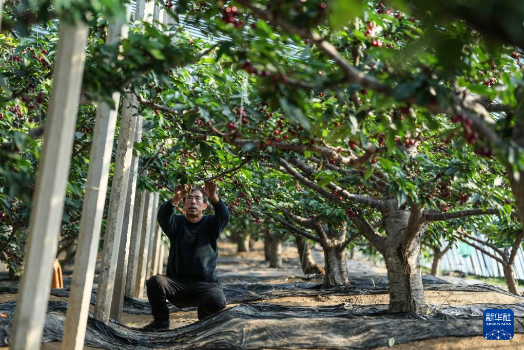 在辽宁省大连市普兰店区四平街道费屯村,谭继冬在樱桃大棚内查看果实成熟情况(1月10日摄)。新华社记者 潘昱龙 摄pagebreak