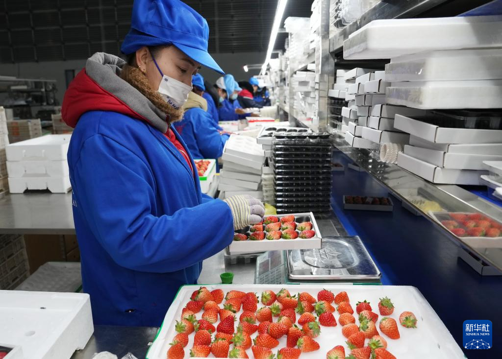 在辽宁省东港市的一草莓包装车间,工人将草莓装盒(1月9日摄)。新华社记者 李钢 摄pagebreak