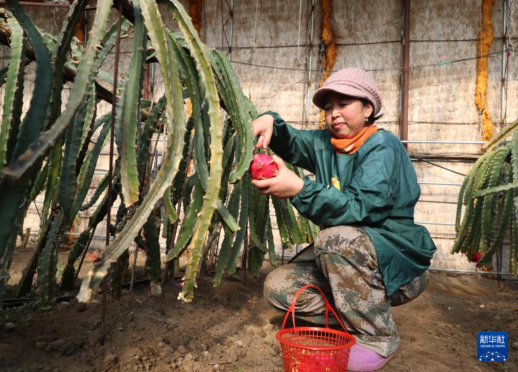 1月24日,在辽宁省辽阳市辽阳县下达河乡大牛岭村,农民在大棚内收获火龙果。新华社记者 杨青 摄