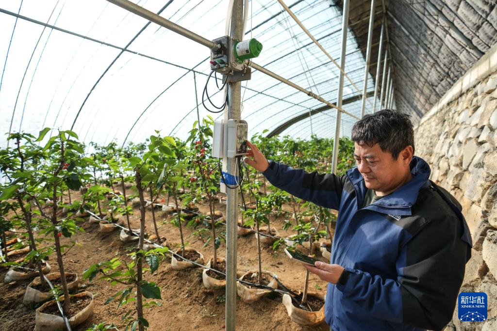 农户在辽宁省大连市贵耀农业专业合作社樱桃大棚内检查设备运行情况(1月10日摄)。新华社记者 潘昱龙 摄