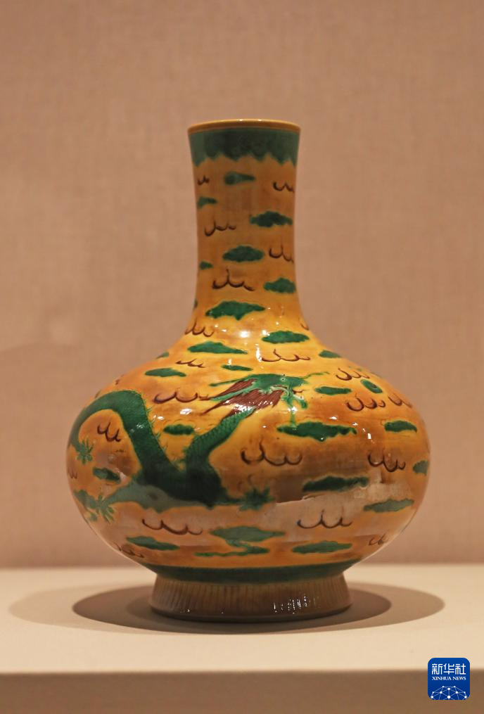 2月2日在辽宁省博物馆拍摄的黄地素三彩云龙纹尊。新华社记者 杨青 摄pagebreak