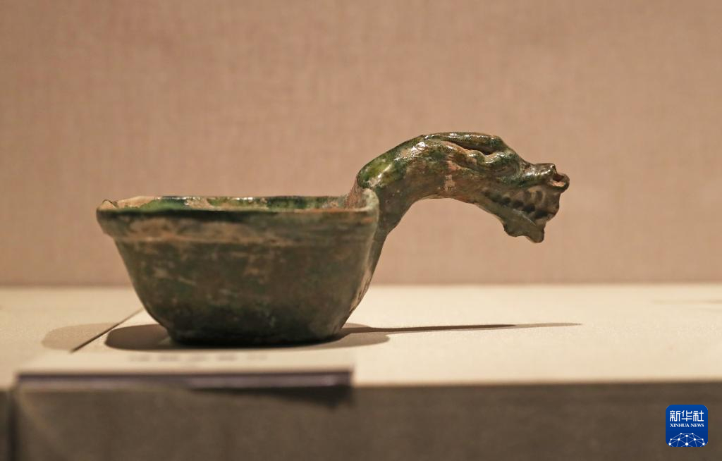 2月2日在辽宁省博物馆拍摄的绿釉龙首勺。新华社记者 杨青 摄