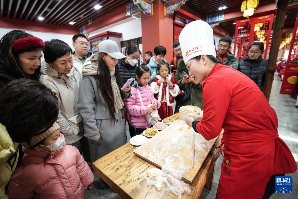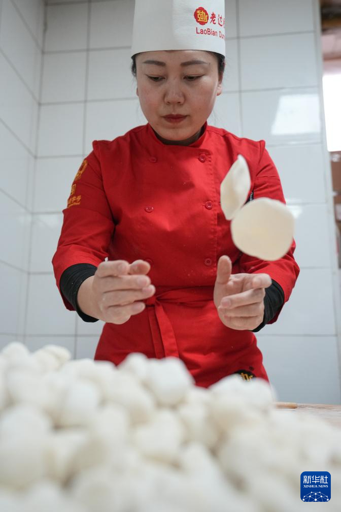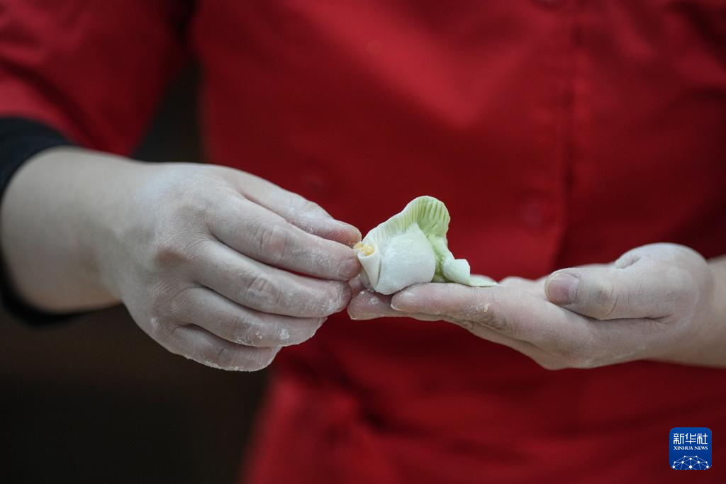 2月14日,郑春香为食客展示如何包饺子。新华社记者 潘昱龙 摄pagebreak