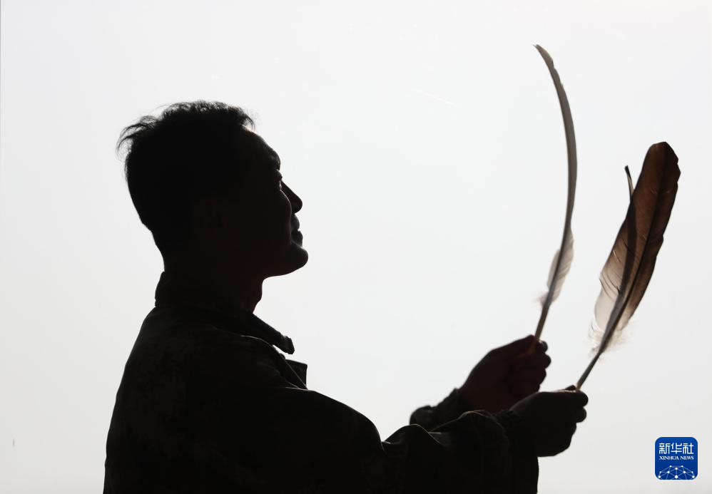 3月18日,在辽河口国家级自然保护区鹤类繁育保护站,赵仕伟收藏一些丹顶鹤掉落的羽毛。新华社记者 杨青 摄