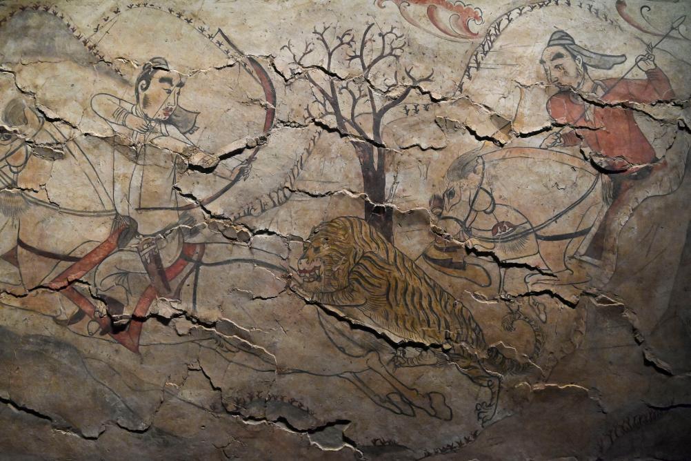 出土于山西忻州九原岗北朝壁画墓。该壁画以山林为背景,描绘了健儿们纵马疾驰,追逐围猎虎、鹿等动物的狩猎场景,场面雄浑,再现了北朝马上民族以围猎进行练兵的历史。