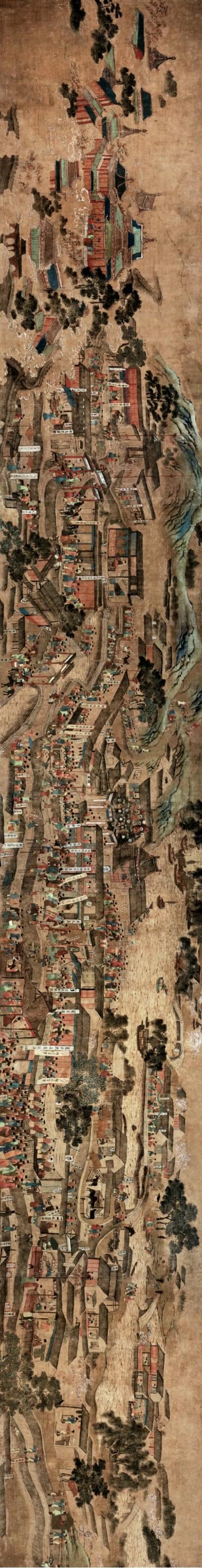 此画卷描绘了明代南京城市商业兴盛的场面。画面从右至左,由郊区农村田舍开始,经城中的南市街和北市街,止于南都皇宫。画卷内共绘有1000多个职业、身份不同的人物和109个商店的招幌牌匾,充分反映了明代城市经济和社会生活的深刻变化。