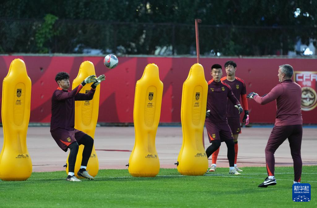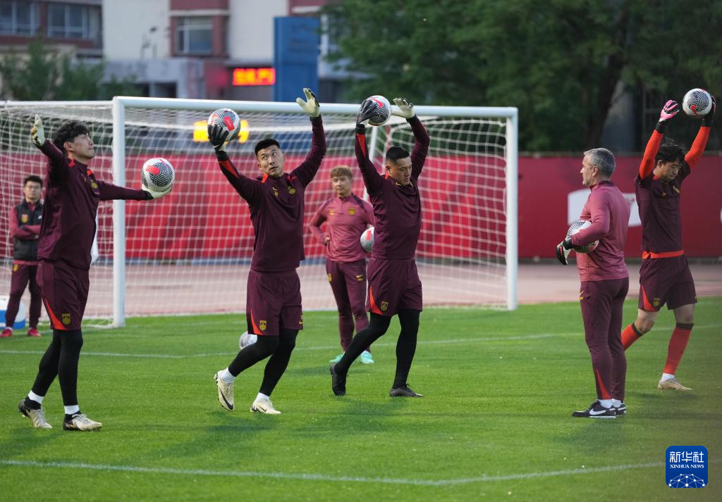 5月27日,中国队门将颜骏凌(左一)在训练中。新华社记者 李钢 摄
