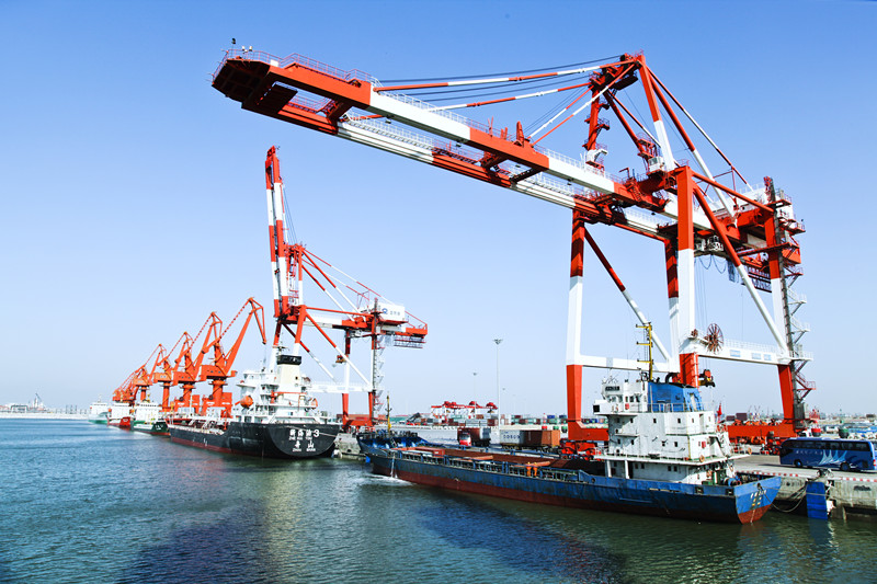 在盘锦港,码头上一排排的吊车不停地运转装卸货物,场内重型卡车穿梭,整个港口一派繁忙的景象。