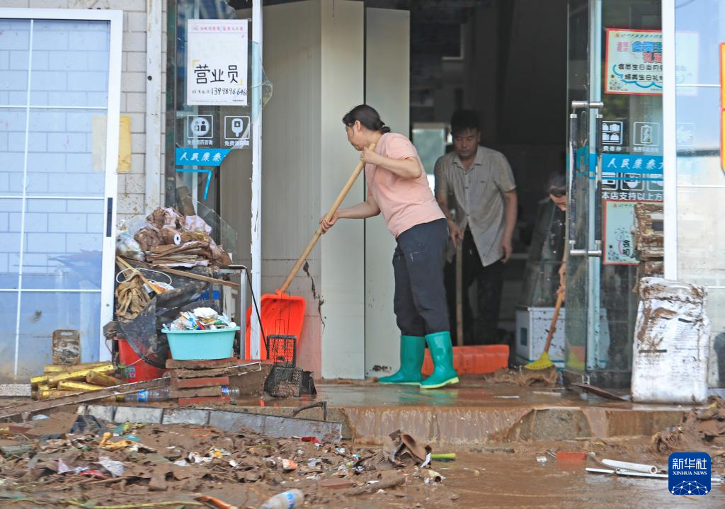 8月21日,在建昌县黑山科乡,受灾居民在清理店铺内积水。新华社记者 杨青 摄pagebreak