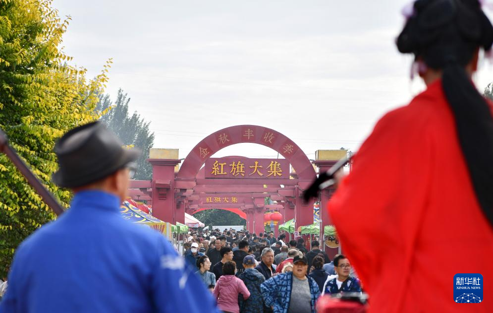 9月15日,市民和游客在红旗大集上观看舞台上表演的东北大鼓。