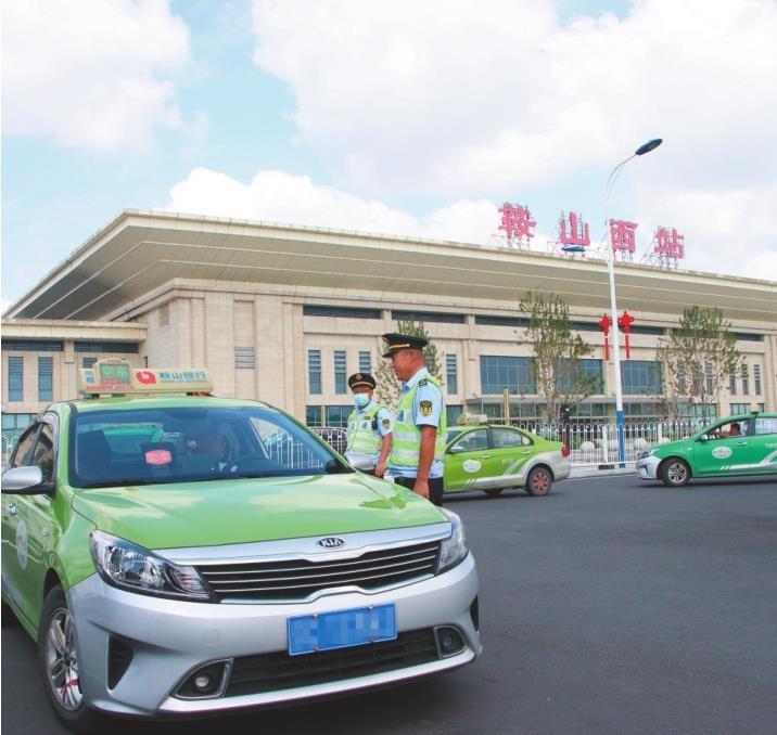 鞍山西站执法人员正在指挥出租车有序搭载乘客。
