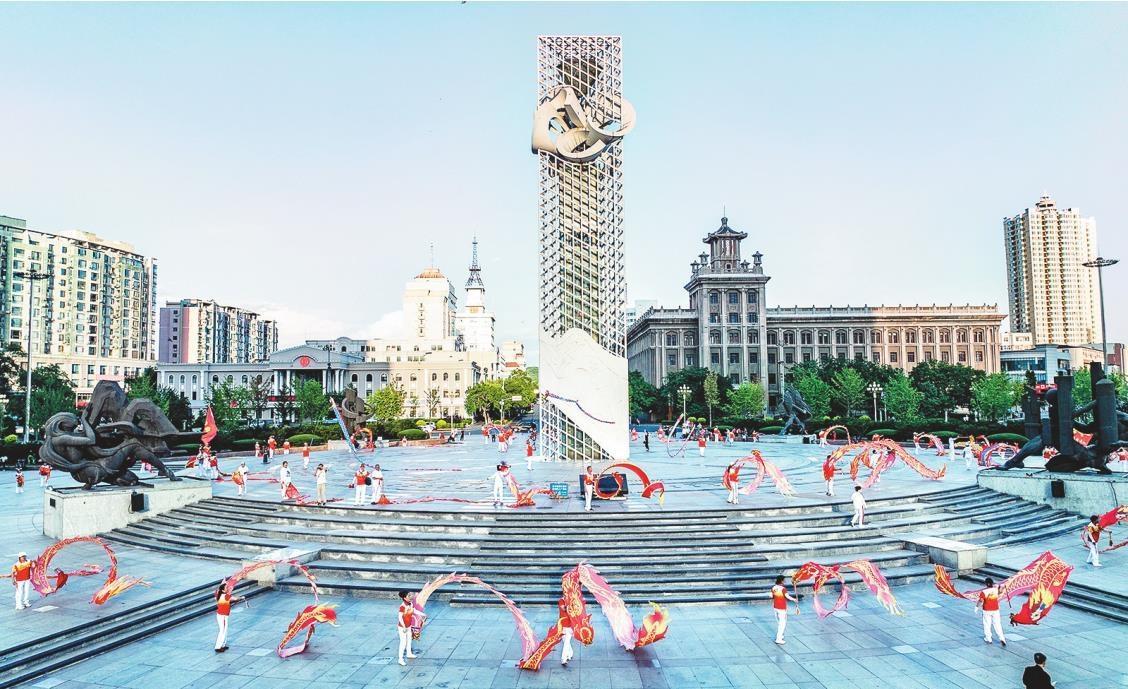 鞍山市市府广场上,健身队伍集体舞龙。林巨学 摄