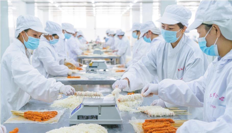 辽宁大红德邻食品有限公司生产车间内,工人在进行食品加工。