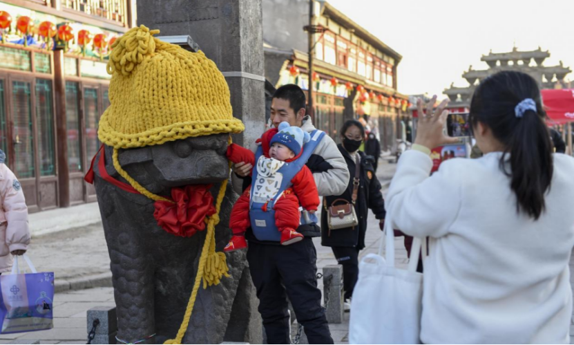 古城中的石狮子也焕然一新。原本威严庄重的它们穿上了色彩鲜艳、设计精巧的新衣。这些新衣融合了传统吉祥图案与现代卡通绘画风格,为古城增添了一份欢快的氛围。