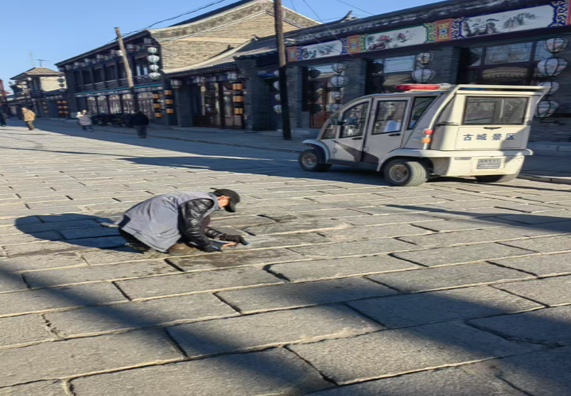 2024年12月31日清晨,当第一缕阳光洒在古城的青石板路上,工作人员已经早早到岗,开始了除冰工作。他们手持铁锹、扫帚等工具,分工明确,协同作战,有的负责铲除积冰,有的负责清扫碎冰,确保地面无结冰。