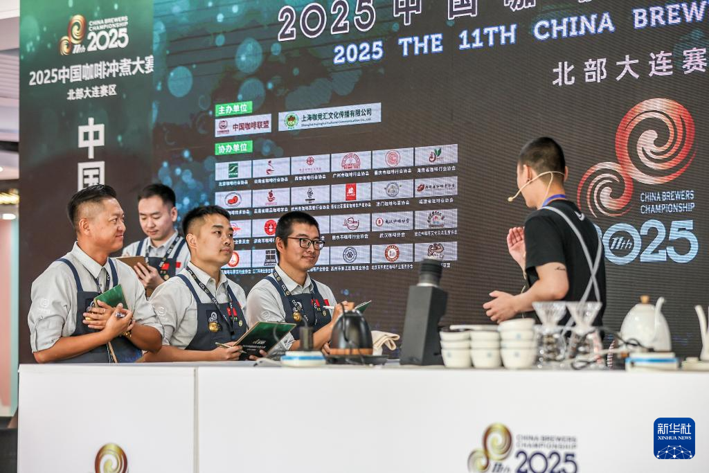 6月28日,刘佳迪(中)在大连举办的一场咖啡冲煮比赛中作为评委品尝参赛选手冲煮的咖啡。