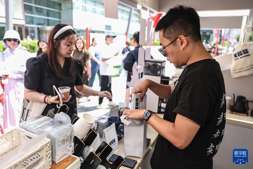 6月21日,在沈阳举行的咖啡市集上,刘佳迪(右)把顾客选购的咖啡豆装袋。