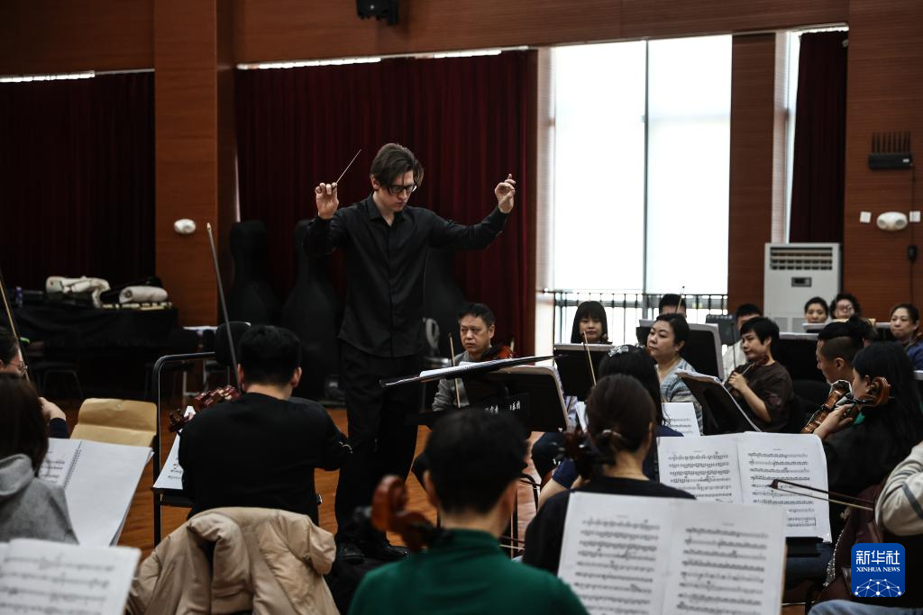 3月31日,来自莫斯科的指挥家安东·托尔别夫指挥辽宁交响乐团演奏《七夕》。 新华社记者 潘昱龙 摄