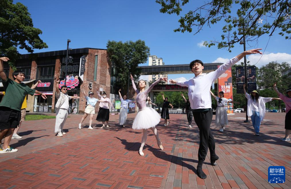 在沈阳红梅文创园,辽宁芭蕾舞团舞蹈演员孙钰佳(右二)带领市民游客体验芭蕾舞(7月30日摄)。