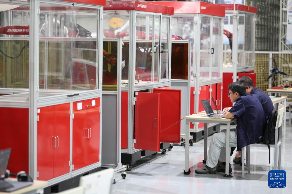 8月27日,在新松机器人自动化股份有限公司车间,工程师在调试工业机器人。